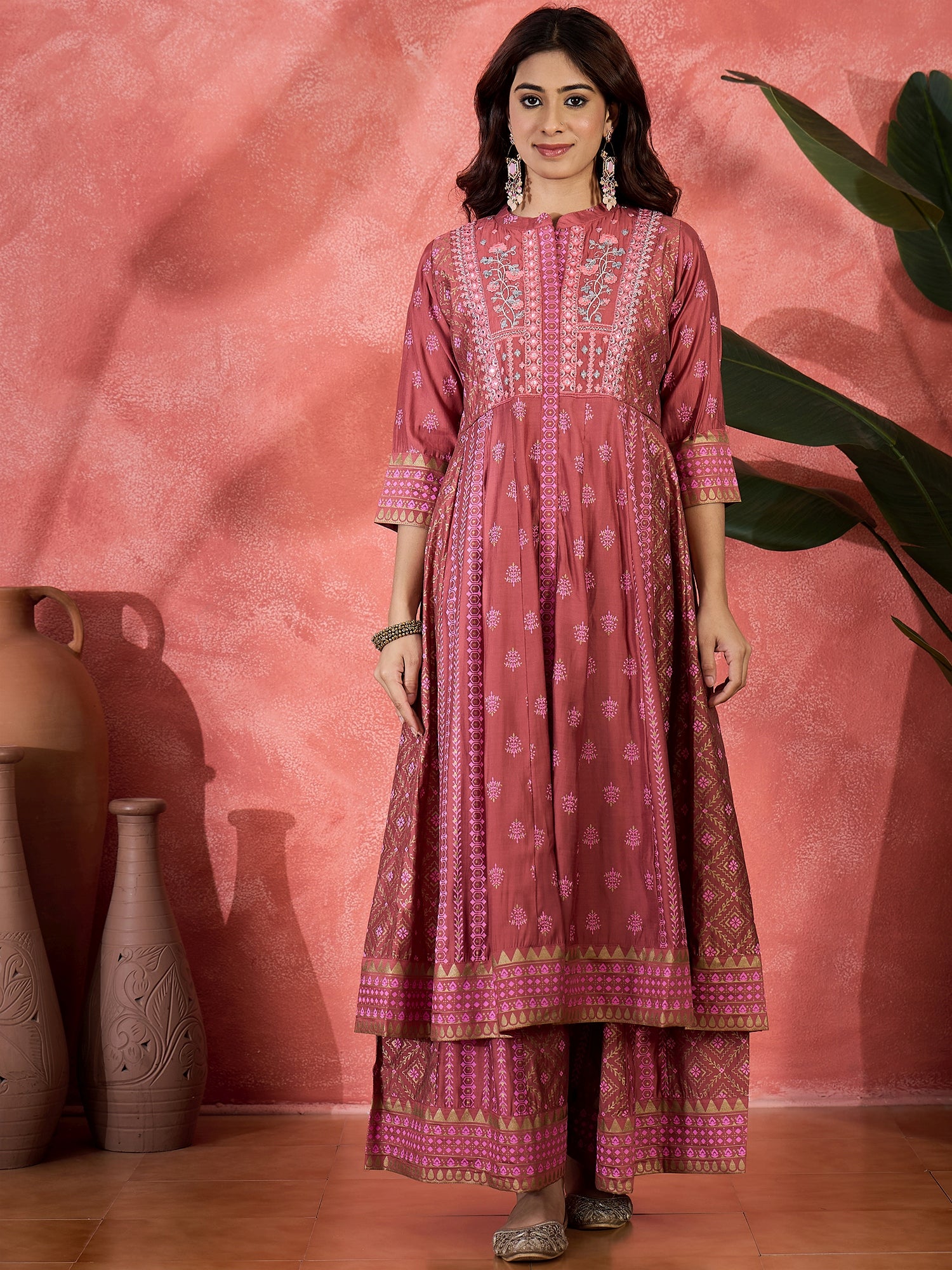 Block Printed & Embroidered Anarkali Kurta & Palazzo With Dupatta