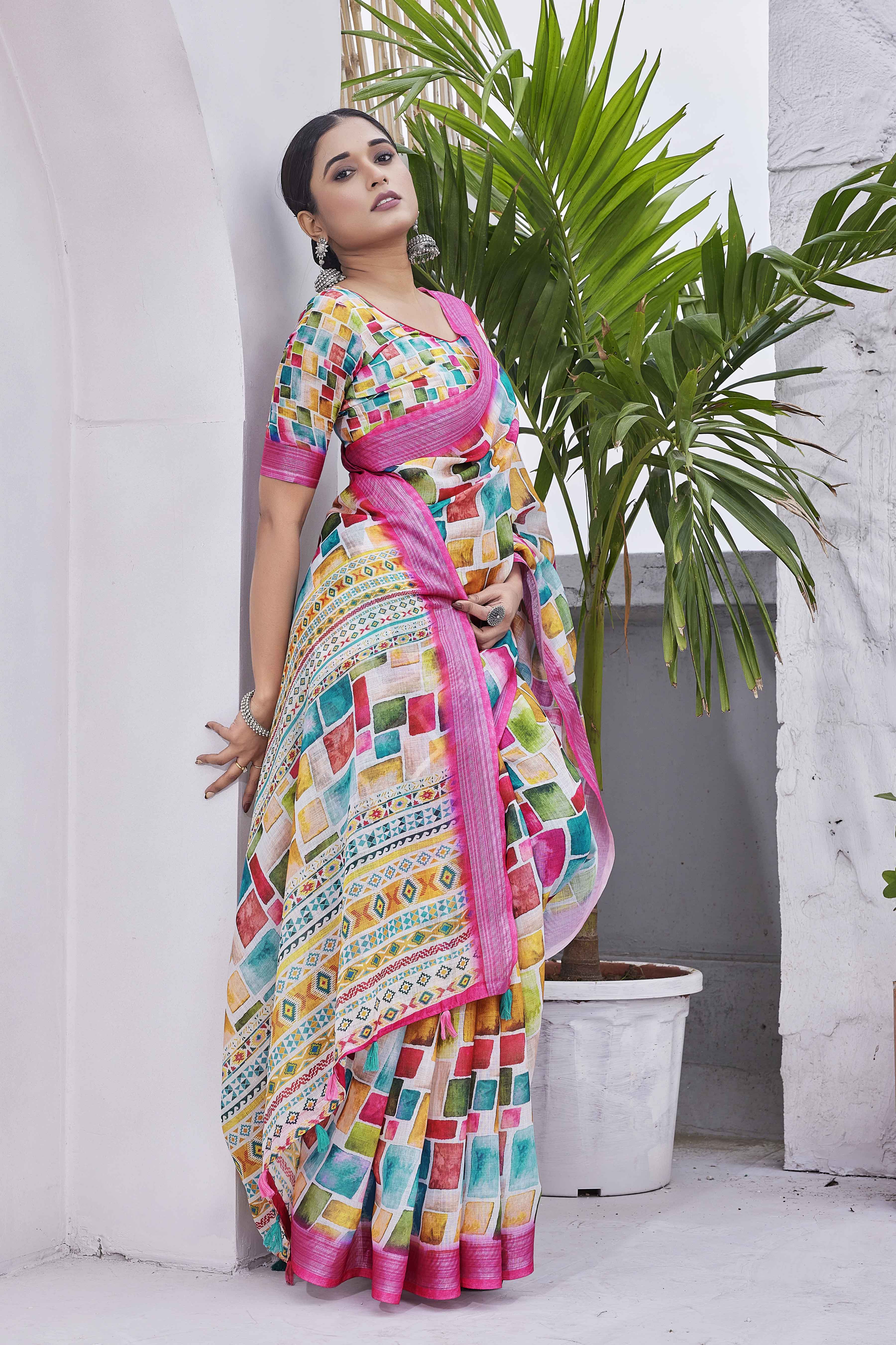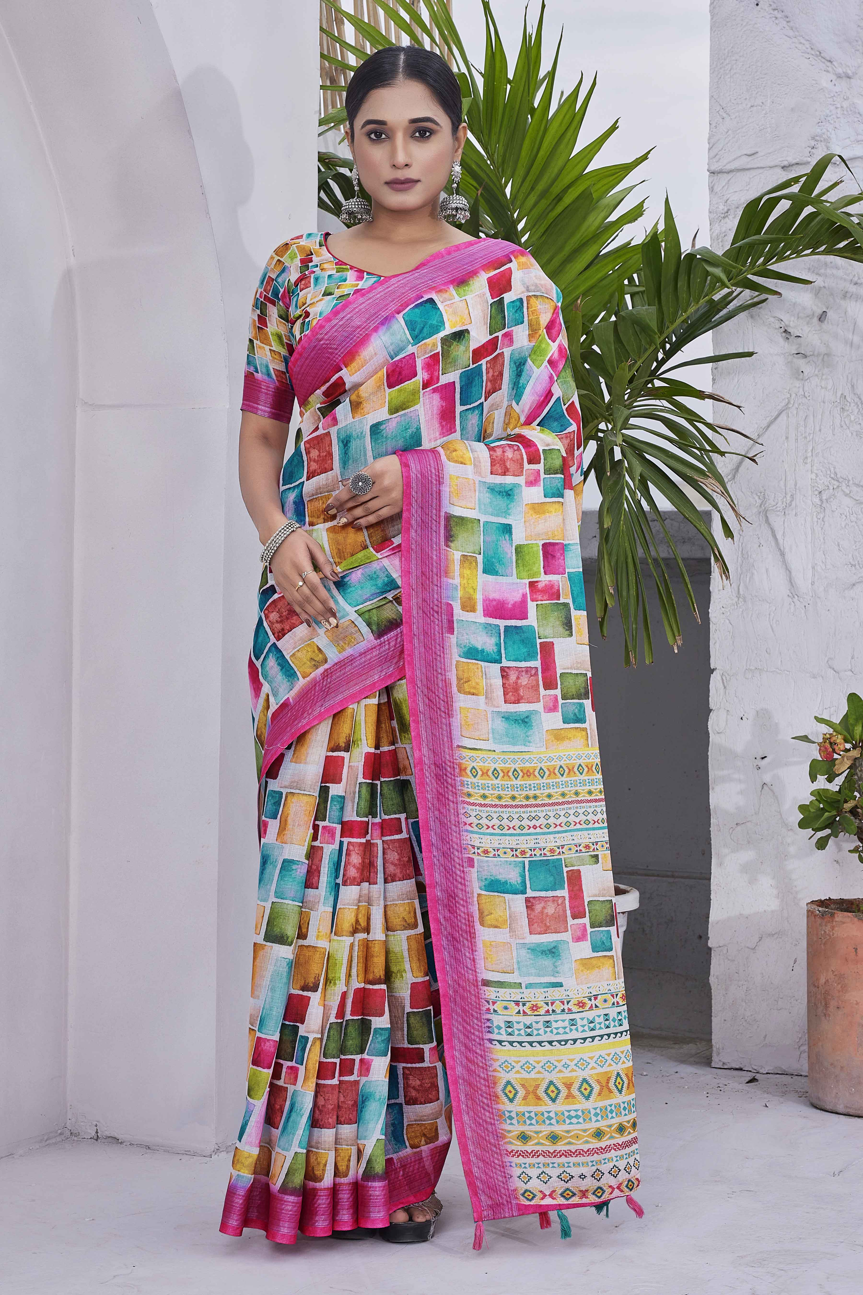 DIGITAL PRINT CHECKED COTTON LINEN ZARI BORDER SAREE