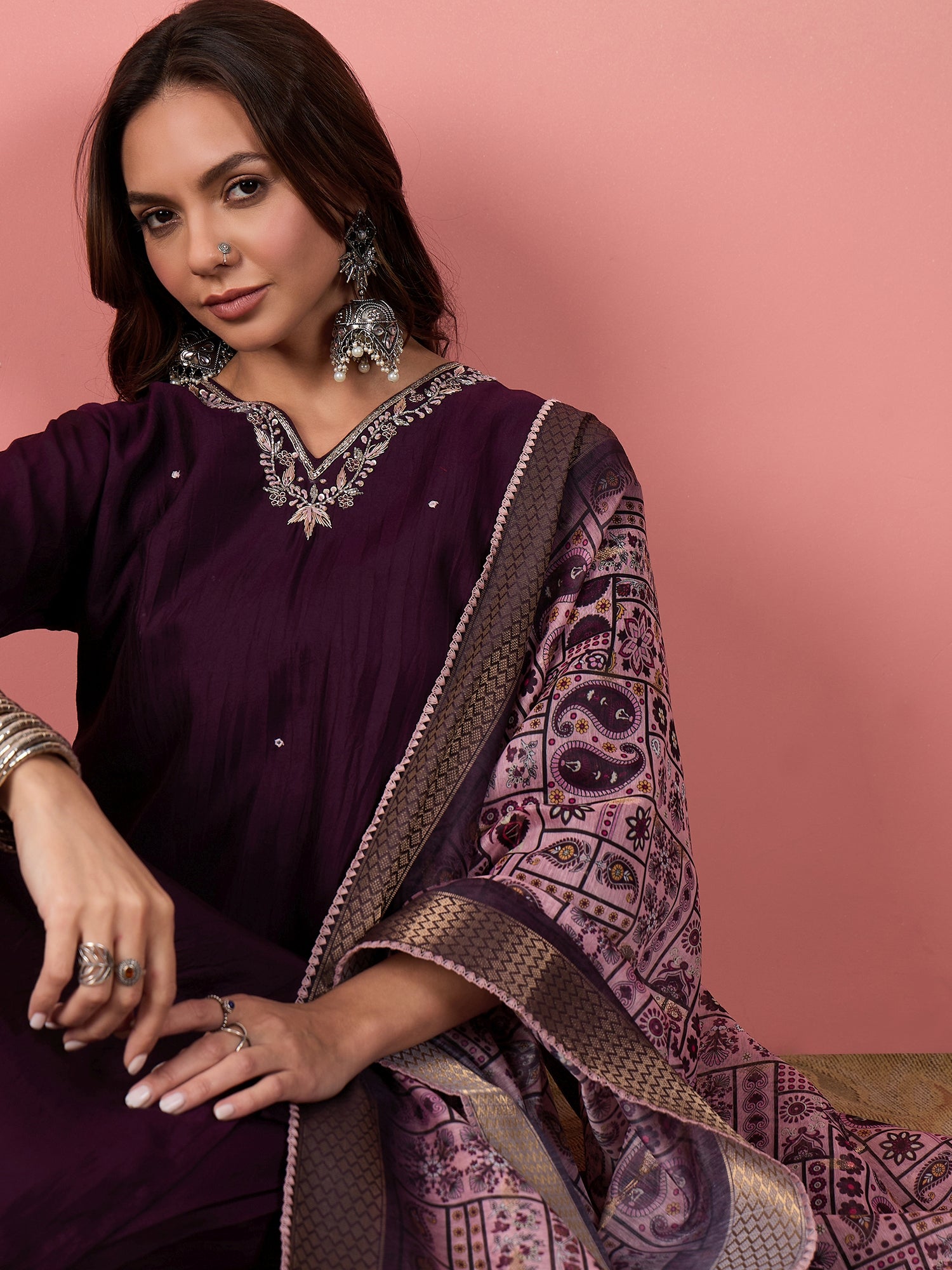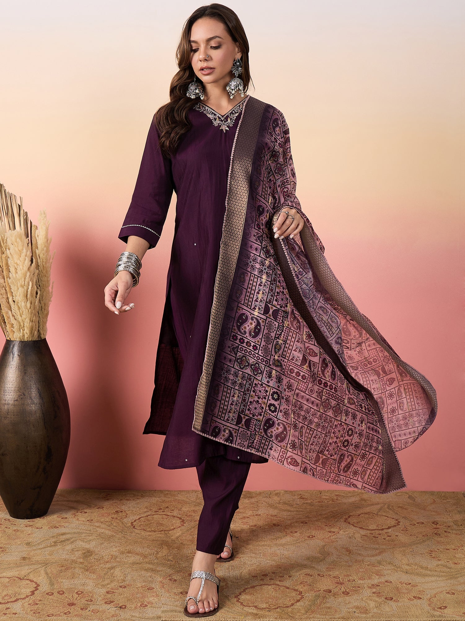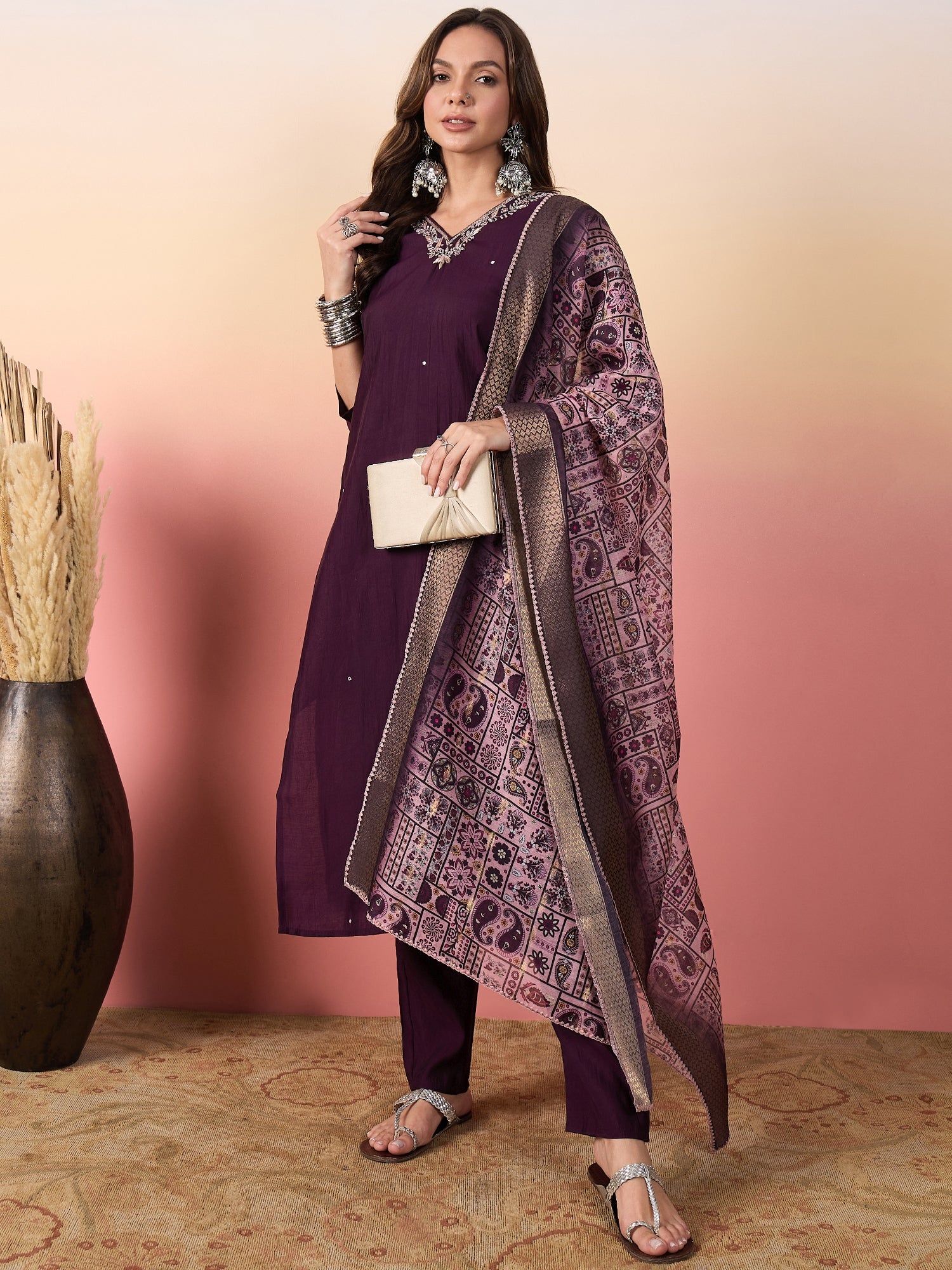 Floral Embroidered V-Neck Thread Work Pure Silk Straight Kurta Set