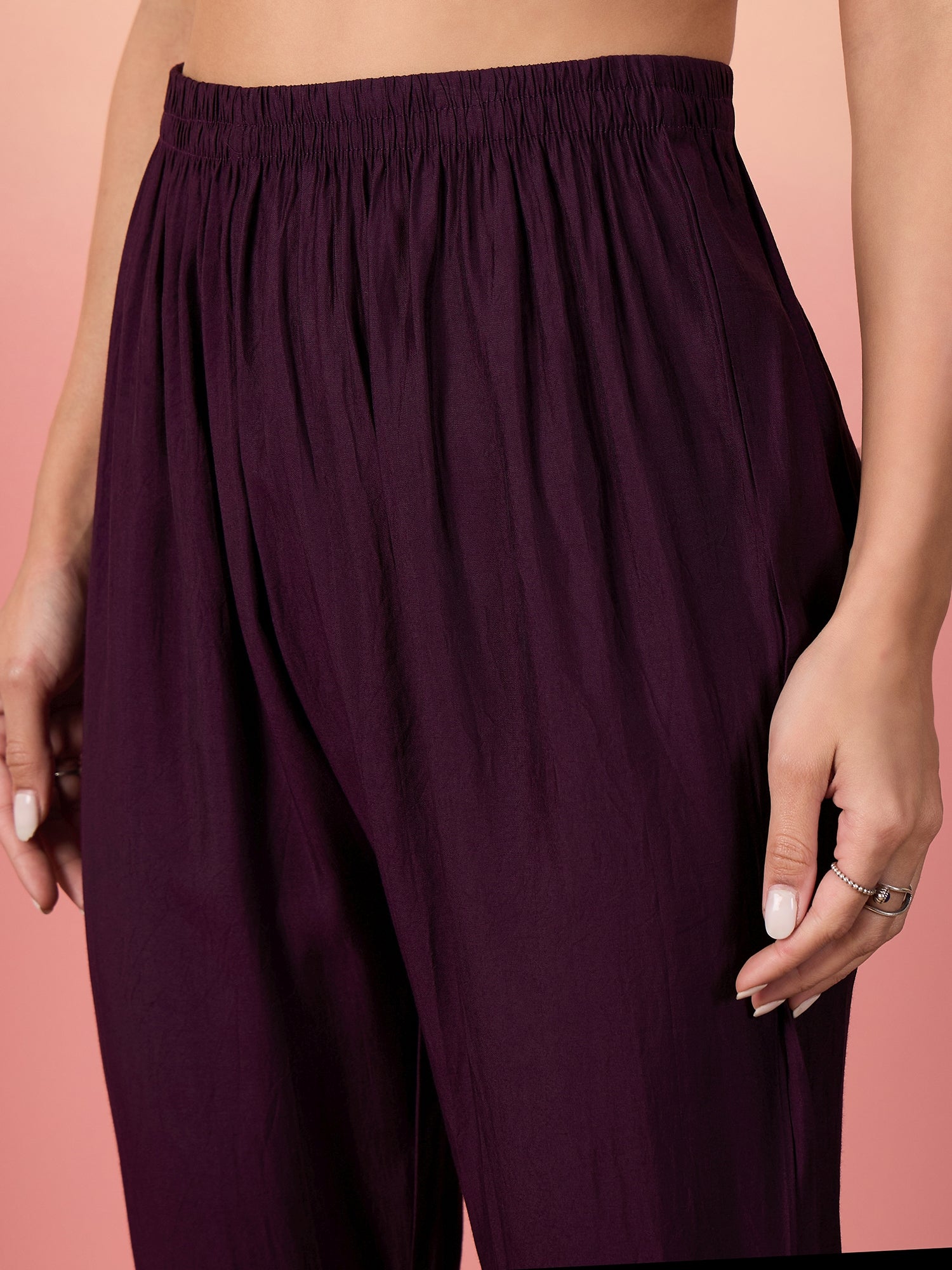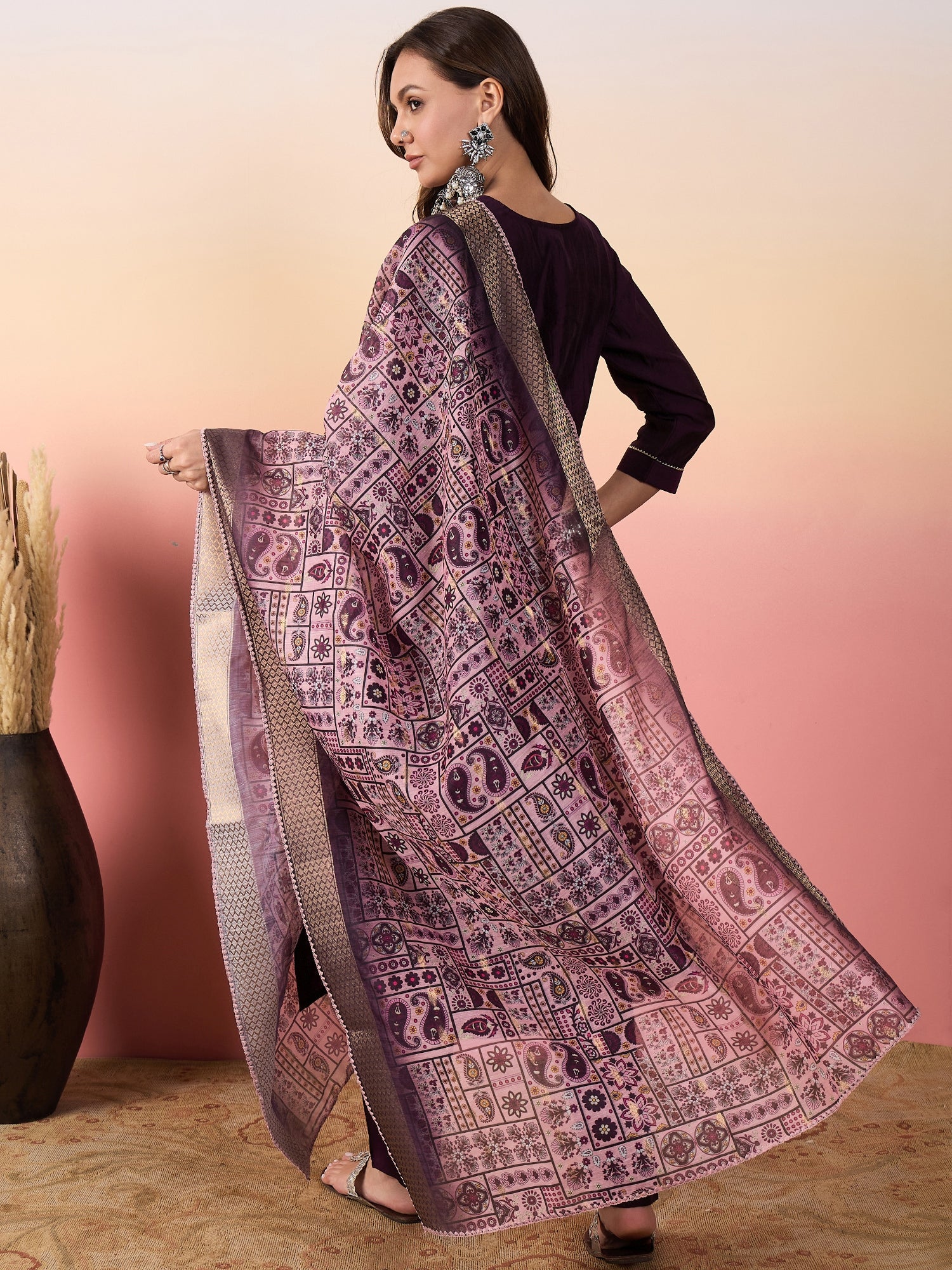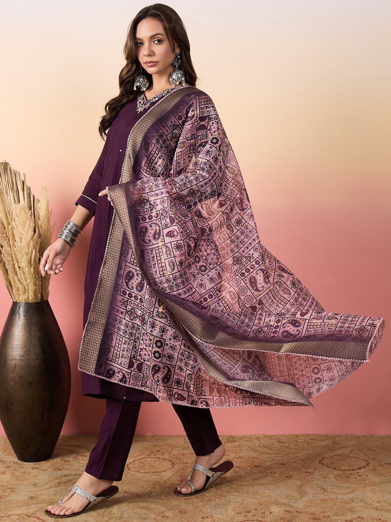 Floral Embroidered V-Neck Thread Work Pure Silk Straight Kurta Set